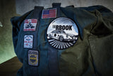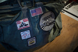 Color: Sage Green.With large hand sewed and embroided US Flag 11/ 7 inch, Big silver ” theRBook” patch 6.7 inch diameter on the back side.